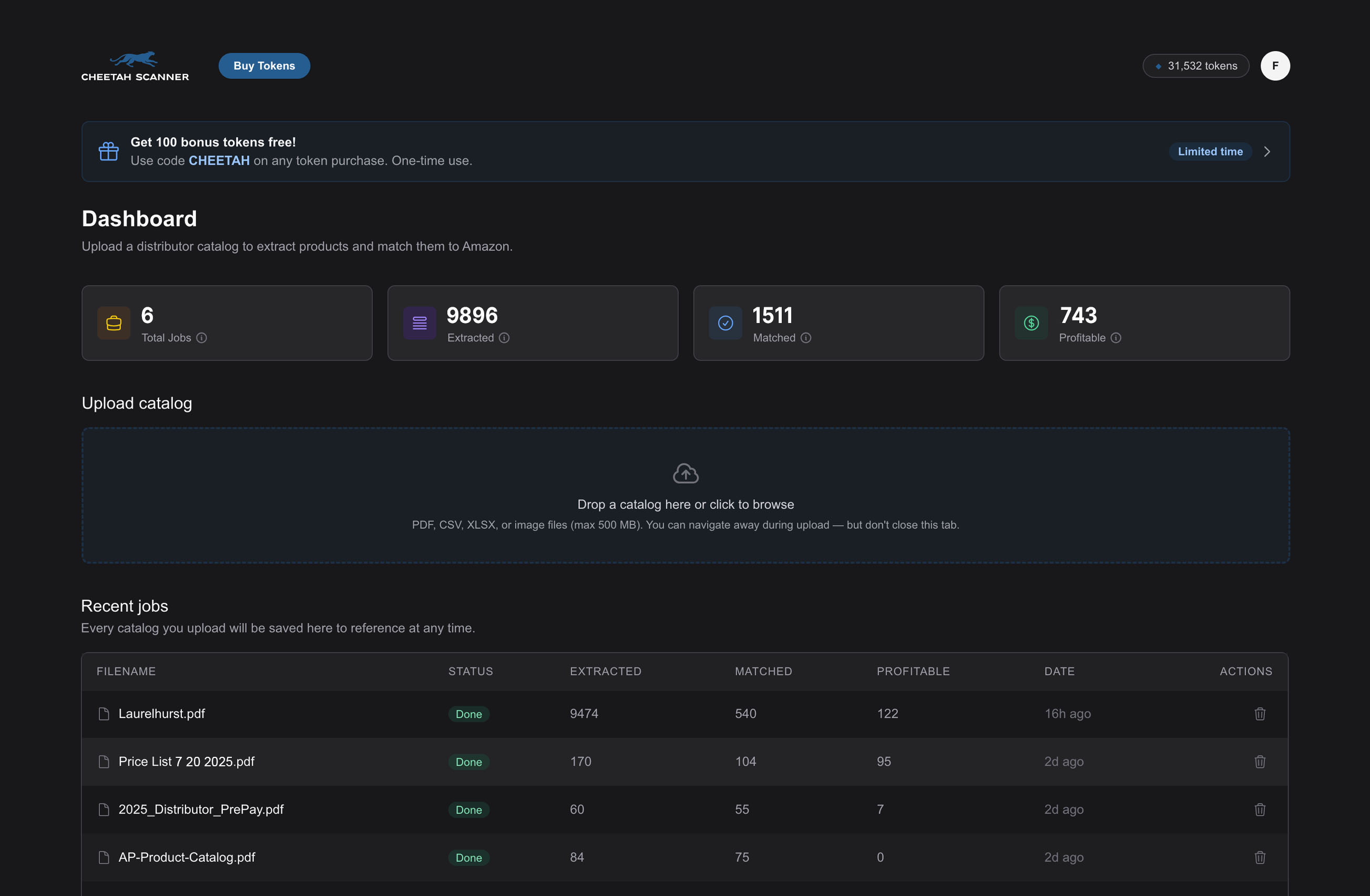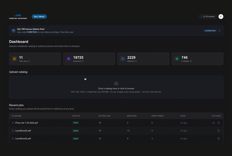 1 token = 1 product search. No subscription required. Pay only for the matches you find.