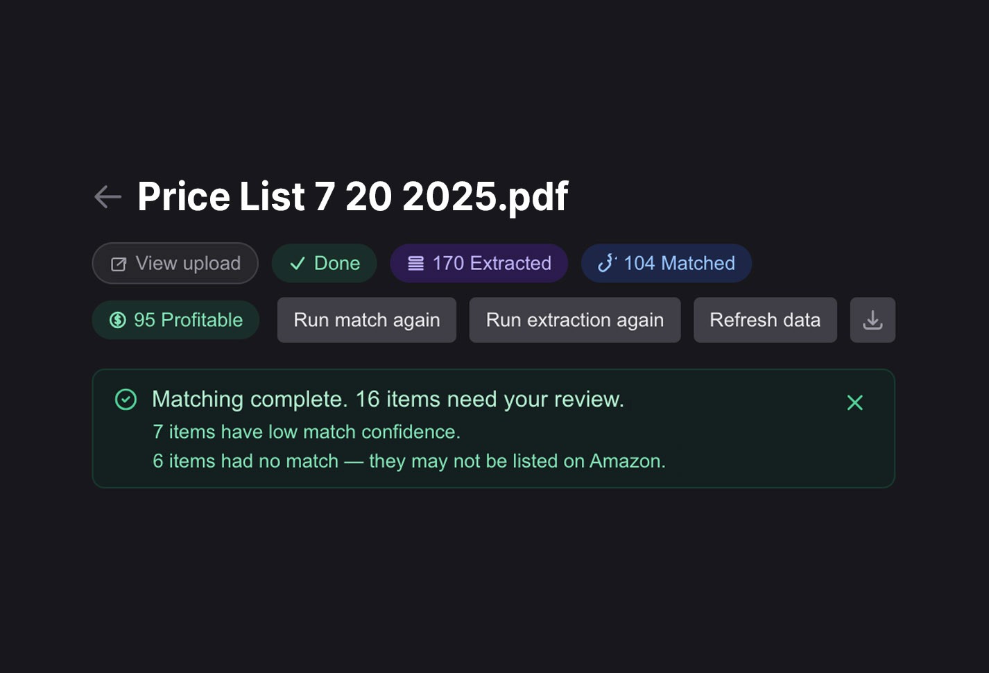 Instantly see estimated profit and ROI for each matched product, including Amazon fees.