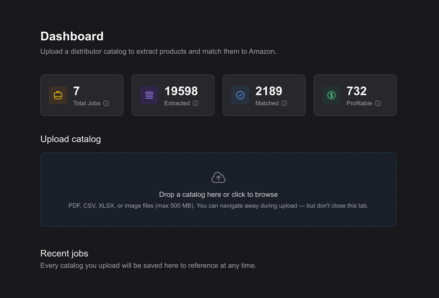 Upload distributor catalogs as PDF, Excel, CSV, or image files.